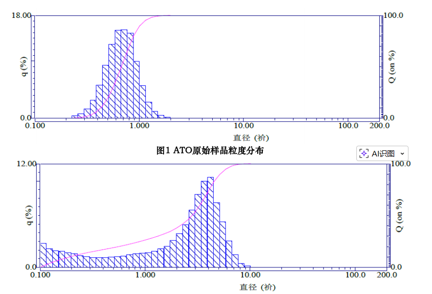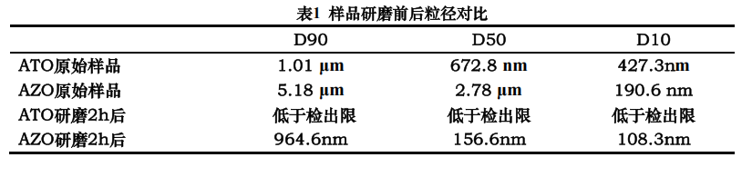 D50=672.8 nm,由于本实验室的激光粒度仪仅能检测100 nm以上的样品颗粒,ATO 研磨后,本实验的激光粒度仪无法检测其粒度分布,说明D50应低于100 nm。